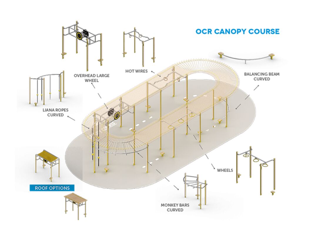De OCR-installatie is een geavanceerde trainings- en wedstrijdinstallatie voor de zogenaamde Obstacle Course Racing (OCR) - een veelzijdige sport die zowel uithoudingsvermogen, kracht, flexibiliteit en coördinatie vraagt. Op een oppervlakte van 18 x 9 meter biedt het parcours zes verschillende obstakel elementen die speciaal zijn ontwikkeld voor overhead training. Hieronder vallen wielen, monkey bars, lianen, een groot overhead wiel, hot wires en een evenwichtsbalk. Deze combinatie maakt intensieve full-body training mogelijk met de nadruk op gripkracht, lichaamsspanning en coördinatie. De installatie is gemaakt van stevige stalen combipalen en optioneel verkrijgbaar met een dak. Ideaal voor outdoor fitnessparken, trainingsfaciliteiten of OCR-verenigingen die hoge eisen stellen aan veiligheid, functionaliteit en sportieve uitdaging.