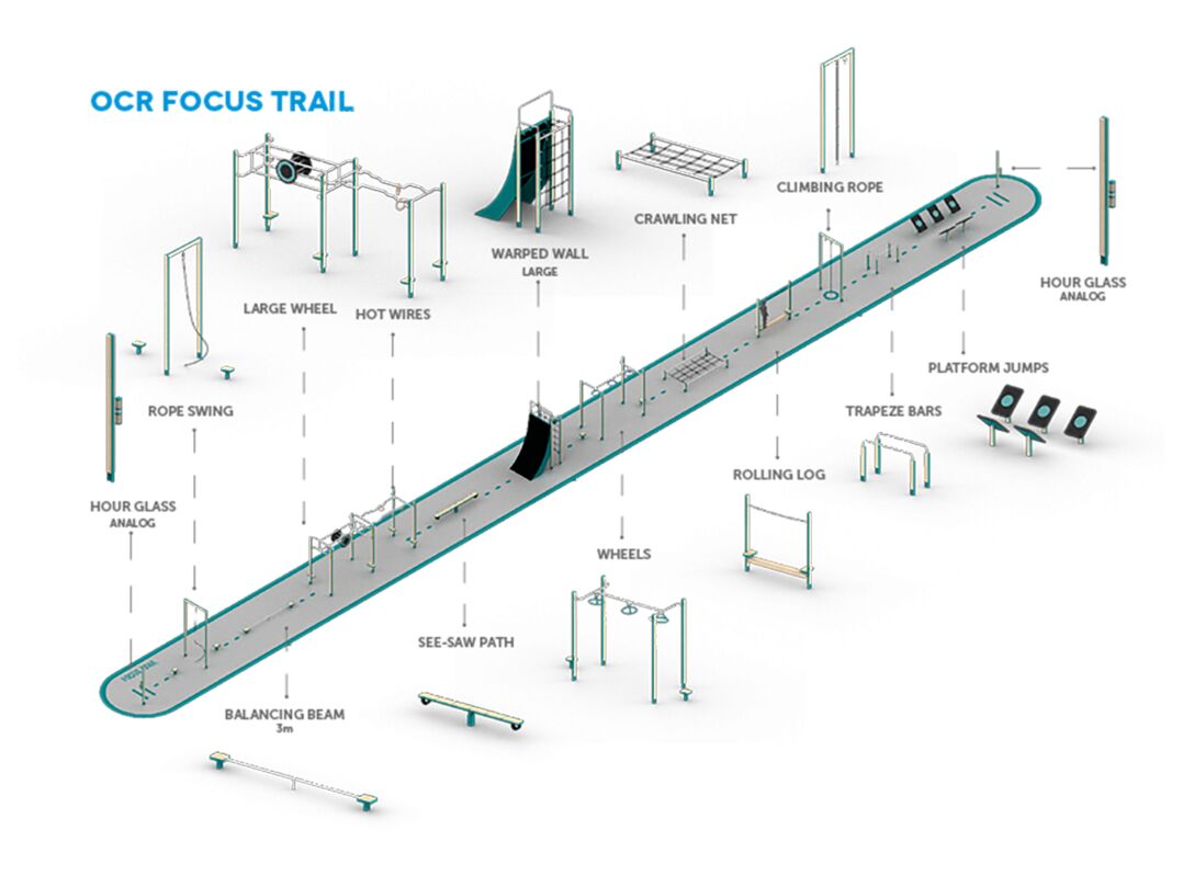 De FOCUS TRAIL is een gebalanceerd OCR-parcours dat zowel lichaam als geest uitdaagt. Met een lengte van 65 meter en een breedte van 4,5 meter biedt dit parcours 13 gevarieerde obstakels die concentratie, precisie en coördinatie gericht stimuleren. Elementen zoals het grote wiel, trapezes, een kruipnet en de Warped Wall zorgen voor een gevarieerde training die kracht, uithoudingsvermogen en balans bevordert. Het parcours is ideaal voor OCR-trainingsgebieden, outdoor fitnessfaciliteiten of uitdagende beweegparken en is ontworpen zodat atleten van alle niveaus hun mentale en fysieke veerkracht kunnen vergroten. De stabiele stalen constructie garandeert geteste veiligheid, duurzaamheid en een modern uiterlijk.