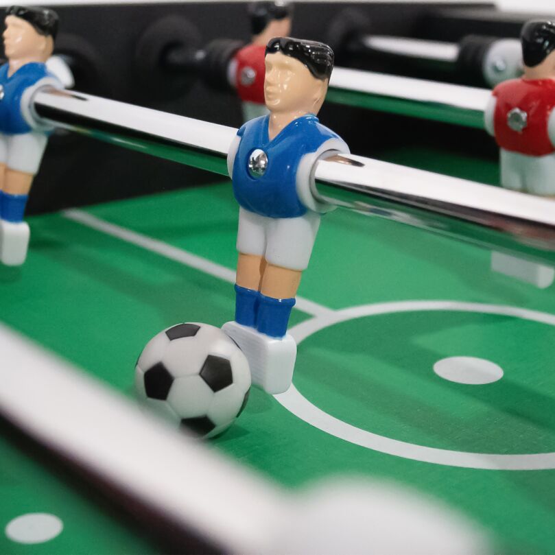 De tafelvoetbaltafel BigFun in elegant zwart biedt plezier voor twee personen, zelfs daar waar weinig ruimte beschikbaar is. Met zijn compacte constructie, slechts twee speelstangen per kant en een comfortabele handgreephoogte van 80 cm is het ideaal voor zowel volwassenen als kinderen. Dankzij de antislip poten en een stevige dwarsbalk staat de tafelvoetbaltafel veilig en betrouwbaar, terwijl de verchroomde 16 mm stangen soepel bewegen in stevige glijlagers. Een licht verhoogd speelveld aan de hoeken zorgt voor een ononderbroken speelervaring. De baluitname aan beide zijden, onbreekbare spelers en het stevige 18 mm frame maken de BigFun tot de ideale metgezel voor feestruimtes, kantoren, verblijfruimtes of voorzieningen voor kinderen en jongeren. Na het spelen kan de handige 21 kg tafel gemakkelijk door één persoon worden verplaatst of ruimtebesparend worden opgeborgen.