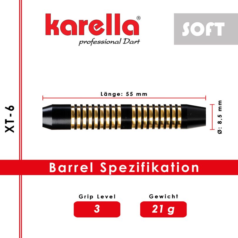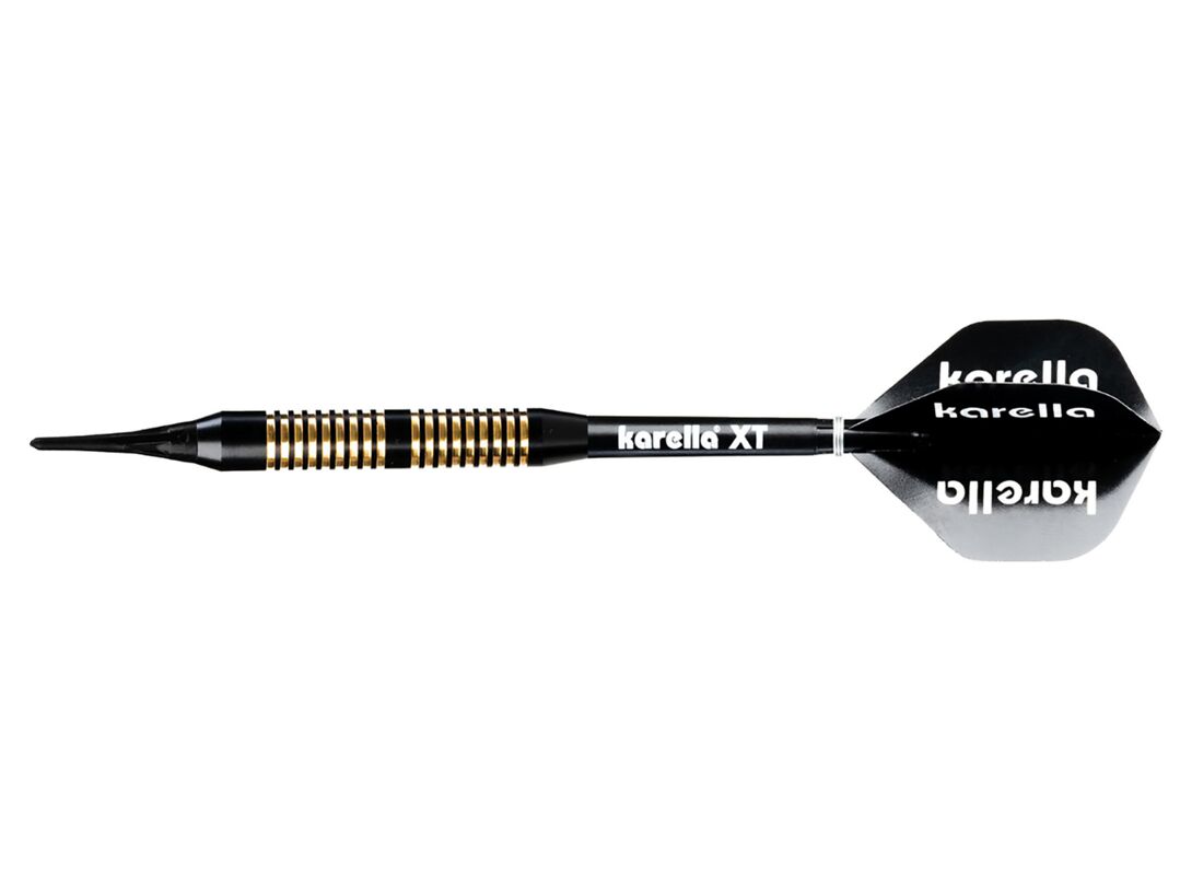 De Karella® Softdart XT-6 met 21 g overtuigt door zijn elegante uitstraling, veilige grip en een gebalanceerd speelgevoel. De hoogwaardig gecoate messing barrel in zwart-goud trekt meteen de aandacht op het dartbord en biedt dankzij de uitgesproken ringstructuur een eenvoudige maar effectieve grip. Hierdoor ligt de dart stabiel in de hand en ondersteunt het een gecontroleerd, nauwkeurig werpgedrag. In combinatie met bijpassende 100 micron dikke XT-Profi flights en zwarte Karella XT shafts in medium lengte is de XT-6 Soft ideaal voor beginners en hobbyisten op elektronische dartborden. De set wordt geleverd in een aantrekkelijke blisterverpakking inclusief handige dartshouder.