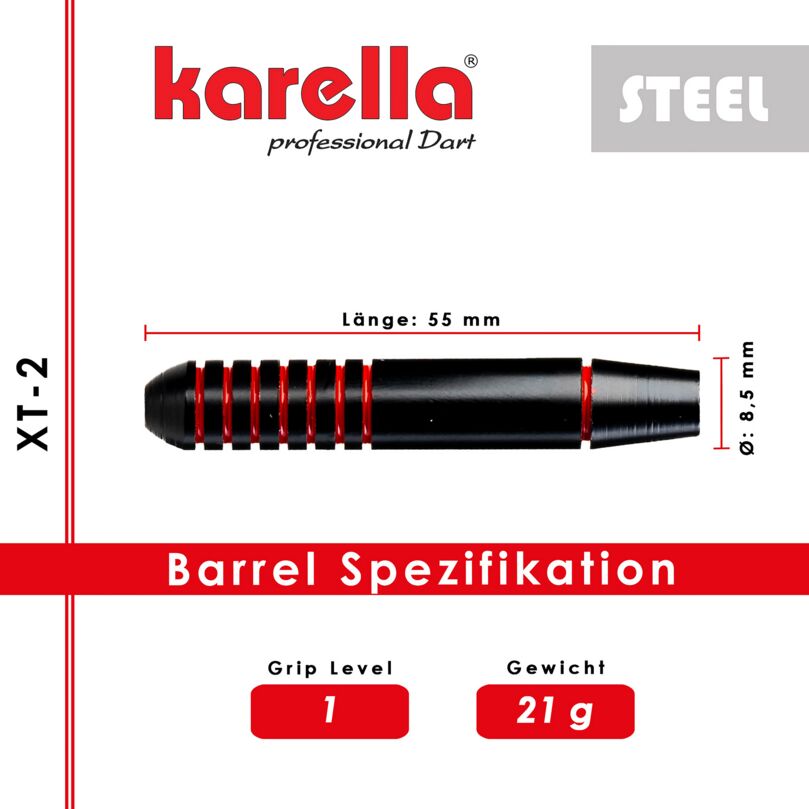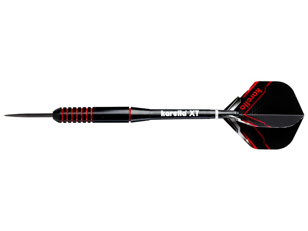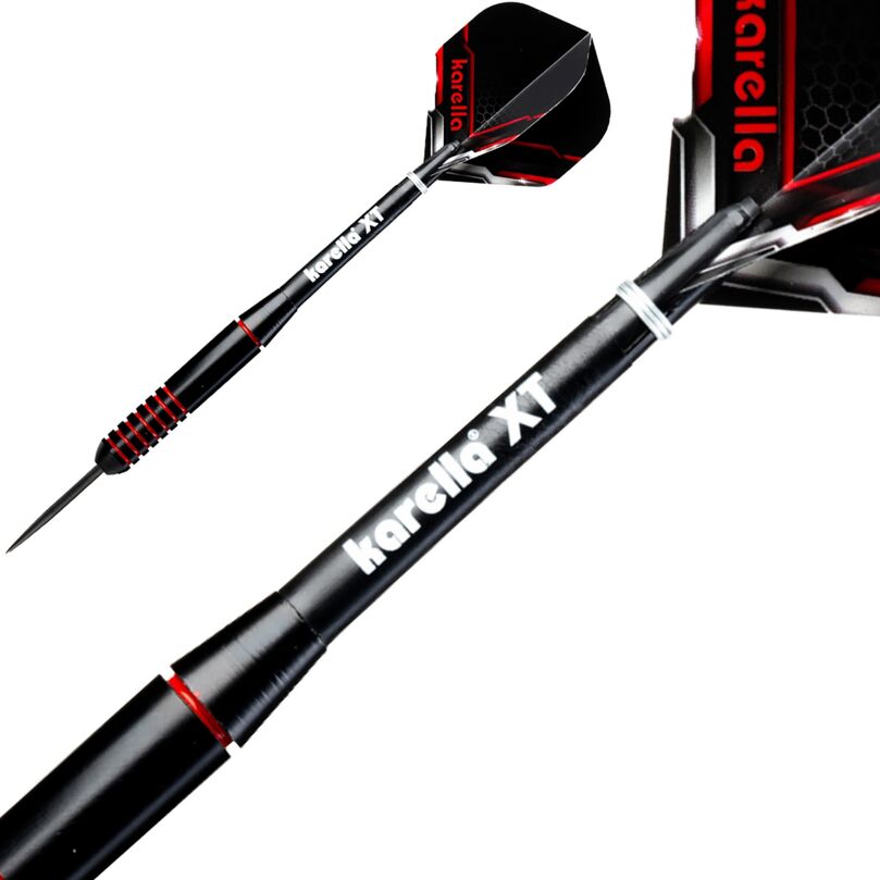 De Karella® Steeldart XT-2 met 21 g combineert opvallend design met betrouwbare speelkwaliteit en richt zich specifiek op beginners en recreatieve spelers. De zwart gecoate, rechte barrel met rode accenten zorgt niet alleen voor een stoere uitstraling, maar ook voor een comfortabele grip. Dankzij de evenwichtige gewichtsverdeling overtuigt de dart met stabiele vluchtpaden en gecontroleerd werpgedrag. Het set wordt compleet gemaakt door bijpassende 100 Mic sterke XT-Profi flights en zwarte Karella XT-shafts in medium lengte. Geleverd in een aantrekkelijke blister inclusief dartshouder is de XT-2 direct klaar voor gebruik.