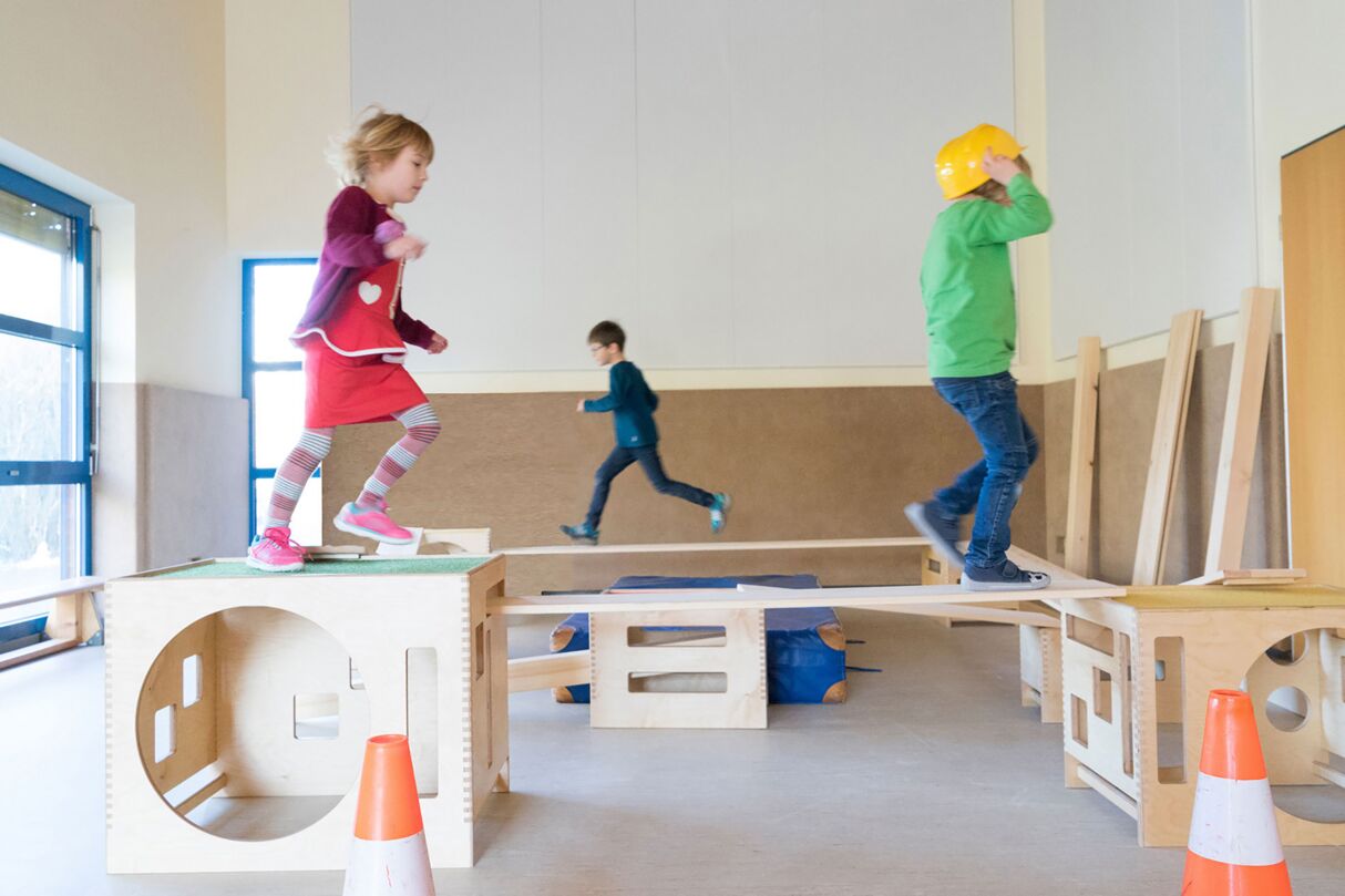 Het bewegingsparcours Fritid voor de kinderopvang en basisschool bestaat uit verschillende maten stapelbare kisten, evenals verschillende lengtes planken, vierkante balken en verschillende houten bouwstenen. Met de transportwagens blijft alles netjes en mobiel voor een nieuwe start de volgende dag.
