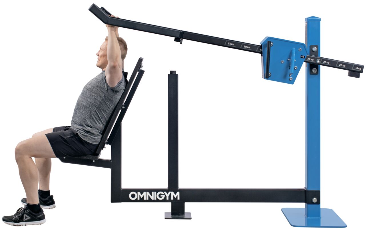 Outdoor fitnessapparaat met een solide constructie, speciale coating en bewegingsarmen van roestvrij staal voor een hoge robuustheid en duurzaamheid. De schouderpress traint vooral de spieren van de schouders en bovenarmen.