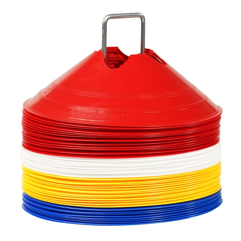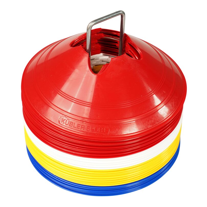 De slijtvaste markeerkappen zijn geschikt voor het dagelijkse trainingswerk. De markeerkegels hebben een diameter van 19 cm en een hoogte van 6 cm. Ze zijn geschikt voor het ondersteunen van staven. De set bestaat uit 15 gele, 15 rode, 10 witte en 10 blauwe markeerkegels. Een transport- en opslagstick wordt meegeleverd.