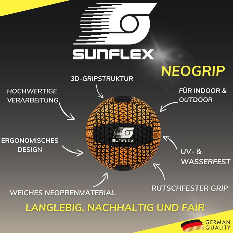 De sunflex® speelbal NeoGrip is de ideale metgezel voor strand, park, vrije tijd en op de speelplaats. De elegante zwarte basiskleur gecombineerd met een levendige siliconenprint zorgt voor een sportief-dynamische uitstraling en goede zichtbaarheid. Dankzij het gripvaste Neogrip-oppervlak ligt de bal prettig in de hand en zorgt voor een veilige balcontrole. Door zijn lichte gewicht is hij bijzonder handig en geschikt voor kinderen en ontspannen spel- en werpoefeningen.