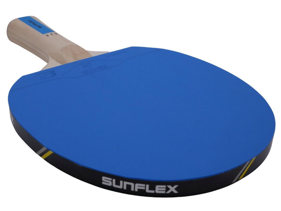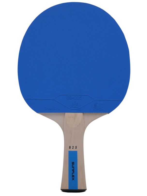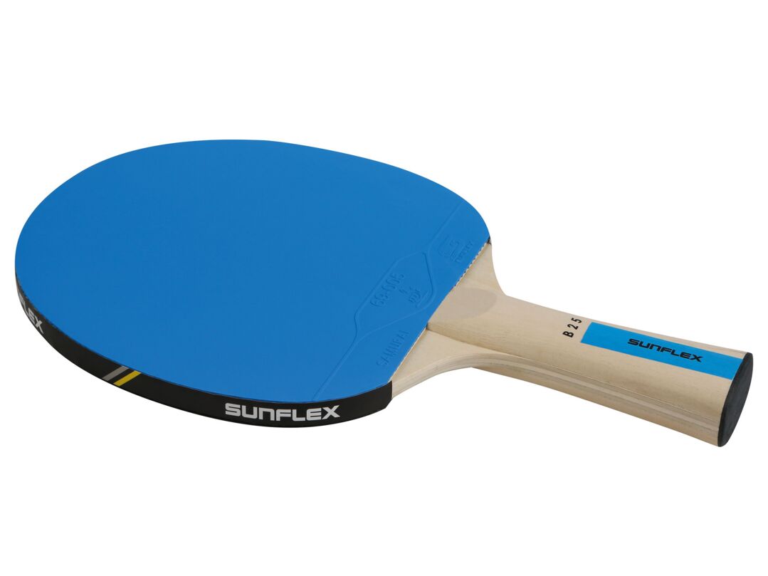 De tafeltennisbat B25 uit de Color Comp serie van sunflex® combineert een aantrekkelijk design met uitstekende speeleigenschappen. De rubbers zijn zwart en blauw, wat vooral bij kinderen en jongeren in de smaak valt. De concaaf gevormde handgreep, het door de ITTF goedgekeurde rubber en de 1 mm dikke spons kenmerken de bat en de speeleigenschappen.